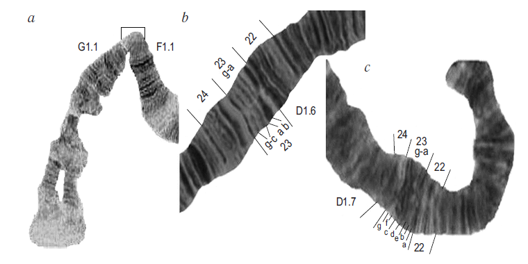 Рис. 1. Хромосомные аберрации плеч G, F, D Glyptotendipes glaucus: а — эктопическая конъюгация плеч G и F (отмечена квадратной скобкой) типа Т–Т; b — гетерозиготная инверсия D1.6; c — гетерозиготная инверсия D1.7. Арабскими цифрами и латинскими буквамиобозначены участки хромосом