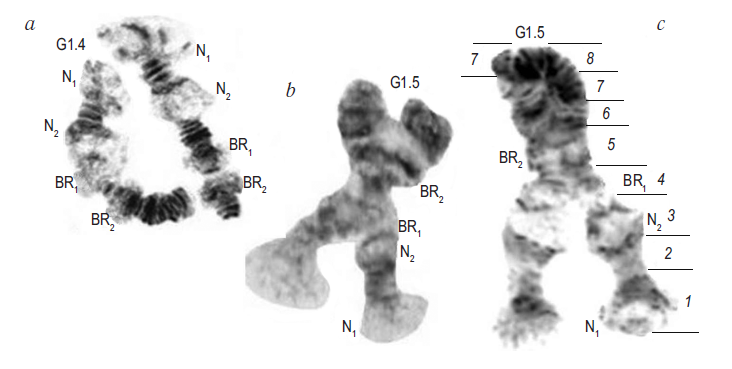 Рис. 2. Инверсионные последовательности хромосомы IV (G) Glyptotendipes glaucus: a — гетерозиготная инверсия G1.4 (асинапсис гомологов); b, c — варианты гетерозиготной инверсии G1.5. Арабскими цифрами и латинскими буквами обозначены участки хромосом. BR — кольцо Бальбиани, N — ядрышковый организатор