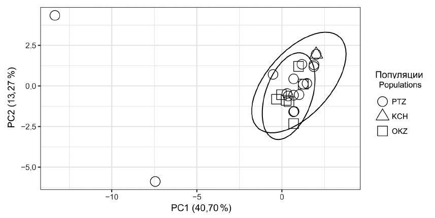 Анализ главных компонент (Principal Component Analysis, PCA) был выполнен с помощью R-пакета аdegenet [21] и визуализирован в R-пакете ggplot2 [22].