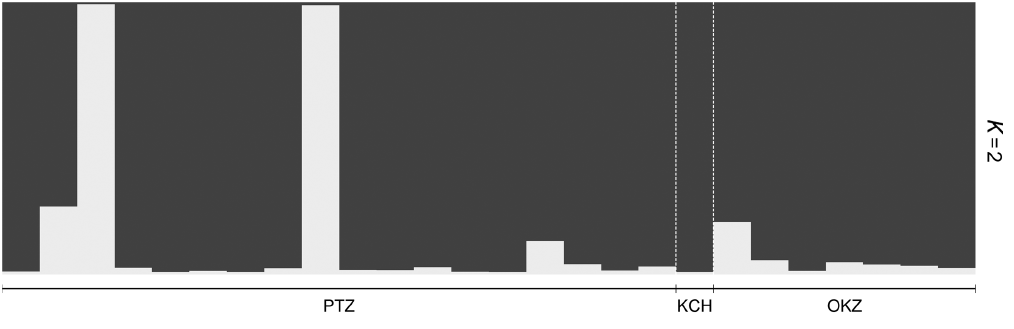 STRUCTURE-анализ (рис. 2) подтверждает наличие двух генетически различающихся исходных групп, принимавших участие в формировании аллелофонда исследуемой популяции зубра. При K = 2, 21 из 26 индивидуумов, в том числе 15 особей PTZ, 1 особь KCH и 6 особей OKZ, формируют первый кластер со средним значением членства Q1/2 = 0,978 ± 0,003 и вариациями от 0,948 до 0,991. Две особи, представляющие группу PTZ, характеризуются высоким значением членства во втором кластере (Q1/2 = 0,993 и 0,990), что указывает на их иное происхождение. Кроме того, в исследованной выборке выделяются 3 особи (2 из группы PTZ и 1 из группы OKZ), генетически более близкие особям первого кластера (Q1/2 = 0,750; 0,877 и 0,806), однако проявляющие сигналы адмиксии аллелей второго кластера (Q2/2 = 0,250; 0,123 и 0,194).