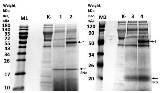 Мы столкнулись с тем, что в культуральной жидкости при росте штаммов-продуцентов как IFNα16-hum, так и IFNγ-chk при сверхэкспрессии гена PpPDI появляется большое количество растворимого белка с молекулярной массой около 50 кДА, не присутствующего в культуральных средах контрольных штаммов (см. рис. 2).