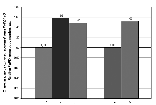 Данные РТ-ПЦР говорят о встройке не более одной дополнительной копии гена. Даже одна дополнительная копия гена под контролем сильного промотора оказывает эффект на скорость роста штамма и продукцию гетерологичных белков. Полученное дробное количество копий гена PpPDI можно объяснить анеуплоидией исследуемого штамма по четвертой хромосоме, где и находится ген PpPDI, а так как референсный ген находится в третьей хромосоме, то он в данном случае не теряет своих референсных свойств.