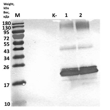 Рис. 5. Иммуноблотинг белков культуральных сред: [M] — маркер молекулярной массы белков. Культуральные жидкости штаммов: [K-] — GS-aox1 при одностадийном культивировании, [1] — GS-humIFNA16 при одностадийном и [2] — при двухстадийном культивировании
