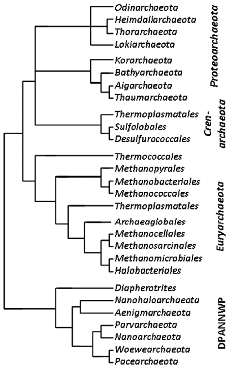 История филогеномики архей началась в 1990-е гг. с изучения эвриархей и кренархей с использованием 16S рРНК в качестве консервативного филогенетического маркера [8]. В последующие годы был применен более широкий спектр маркеров, в том числе наборы рибосомных белков [9], осуществлено полногеномное секвенирование, использованы новые методы и модели филогенетического анализа, включая сетевые технологии. Различия в топологических схемах, разработанных разными авторами, зависят от выбранного методического подхода. На рис. 1 приведена обобщенная (по данным на 2016 г.) филогенетическая схема, отражающая взаимоотношения трех суперфилумов архей: Euryarchaeota, DPANN, Proteoarchaeota [10–12].