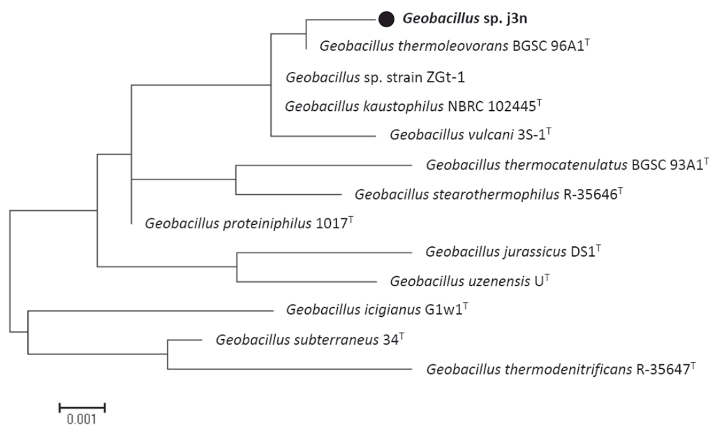 The nucleotide sequence obtained from the 16S rRNA gene of strain j3n was 1396 nucleotides long and after removal of bad quality sequence at the beginning final length of the sequence was 1369 nucleotides. Blast search of database of NCBI revealed affiliation of strain j3n within the family Bacillaceae of the class Bacilli of the Firmicutes. The closest cultivated relatives of strain j3n were spore –forming bacteria of the cluster of Geobacillus kaustophilus – thermoleovorans (Fig. 1).