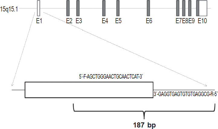 Fig. 1. Illustration of RAD51 gene describing the location of the target area on chromosome 15 including 10 exons. The primers positions and the expected product size (187 bp) are shown. The amplified area is including part of exon 1 and intron 1