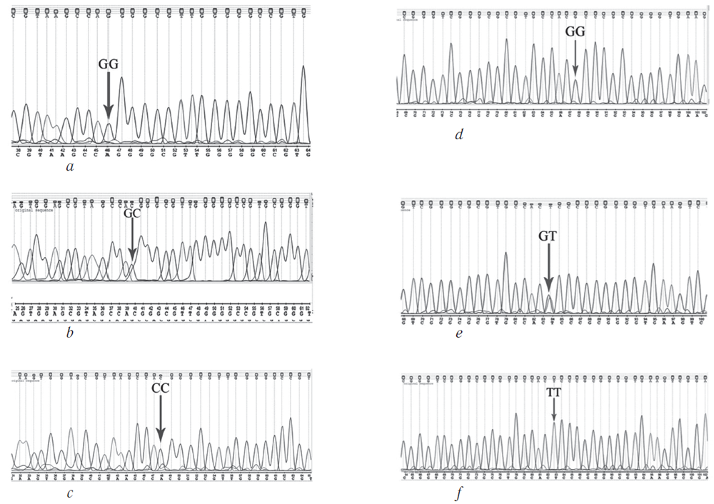 Fig. 3. Chromatogram of the target sequences in the 5’-UTR-RAD51 area. a, b and c represent the GG, GC and CC genotypes of the rs1801320 G>C polymorphism. d, e and f represent the GG, GT and TT genotypes of the rs1801321 G>T polymorphism