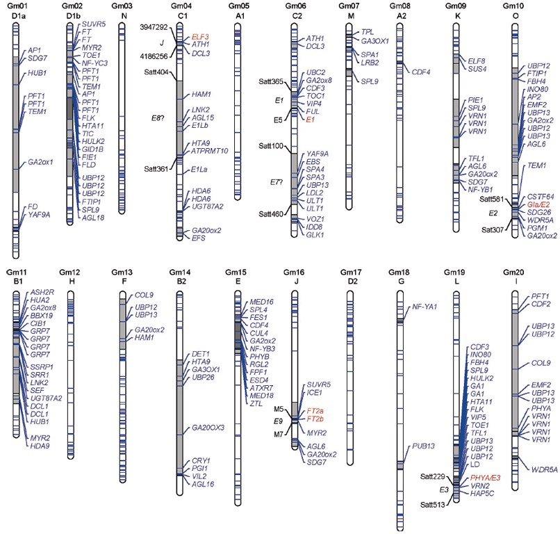 В общей сложности у сои было зарегистрировано 228 QTL, контролирующих фотопериодические реакции [25, 51, 88, 103]. Генетическая система, детерминирующая время цветения, представляет собой комплекс QTL/генов, работающих вместе как генные сети, включающие ряд биологических процессов, прямо или косвенно связанных с временем цветения [108].