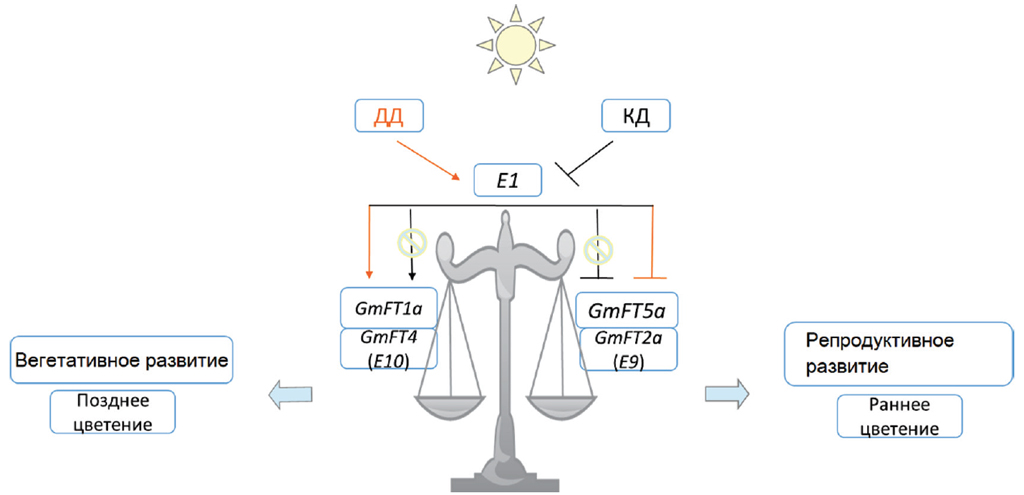 Рис. 2. Регуляция перехода развития от вегетативного к репродуктивному у сои в условиях длинного (ДД) и короткого дня (КД). Стрелки — стимуляция экспрессии генов под влиянием ДД. Серая Т-образная — ингибирование экспрессии генов под влиянием ДД. Перечеркнутая черная стрелка — отсутствие стимулирования генов на КД. Перечеркнутая Т-образная линия — отсутствие ингибирования генов на КД. Черная Т-образная линия — отсутствие влияния КД на ген E1. Широкие стрелки — итоговое влияние генов на развитие растений
