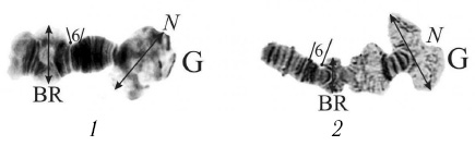 Fig. 1. Measured sites of chromosome IV (G): 1 — C. plumosus; 2 — G. glaucus
