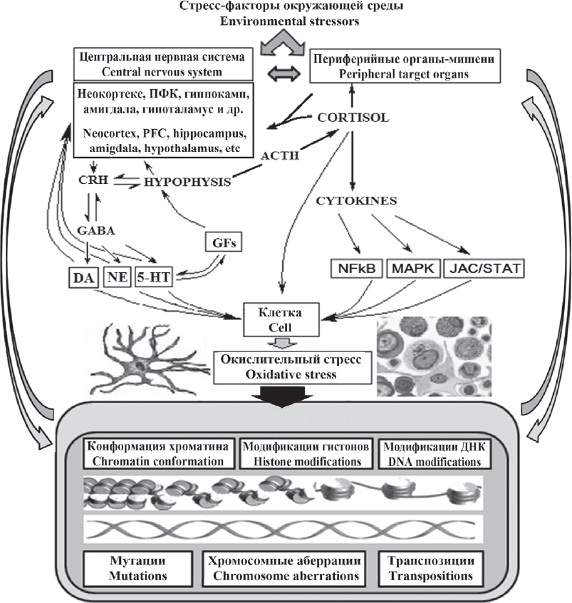 Изучение последствий организменного стресса на молекулярном уровне показывает, что прежде всего компоненты каскада нейро-эндокринно-иммунных реакций регулируют активность генов в клетках мозга и периферийных тканях посредством эпигенетических модификаций [12, 15, 16].