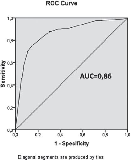 На рис. 1 изображена ROC-кривая, координаты которой представляют значения анализируемого параметра и уровни чувствительности и специфичности теста [11]. Исходя из требований оптимального баланса чувствительности и специфичности, величина порога отсечения (точка cut off) для данного объема выборки составляла 35 лет курения при значении площади под кривой (AUC — Area Under Curve) 0,86 (95 % CI: 0,83–0,89; p = 0,001). Чувствительность и специфичность теста были 72 и 77 % соответственно, то есть в анализируемой выборке при определении порога отсечения длительности курения 35 лет мы идентифицируем 72 % больных ПРЛ и 77 % здоровых мужчин. Построенная модель имеет хорошую предсказательную способность. Поэтому далее исследуемые группы были разделены на две подгруппы в зависимости от длительности курения — менее 35 лет и более 35 лет.