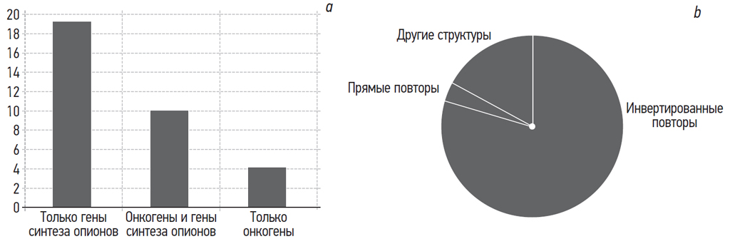 На втором месте по численности расположились виды, содержащие протяженные фрагменты Т-ДНК с онкогенами и генами синтеза опинов. Протяженные клТ-ДНК в большинстве своем представлены инвертированными несовершенными повторами (см. рисунок, b) и часто содержат наряду с хорошо известными генами Т-ДНК новые малоизученные последовательности, как правило, относимые к plast-генам [14, 15, 25, 26], что свидетельствует о более широком разнообразии агробактериальных штаммов, трансформирующих растения, чем мы представляли ранее.