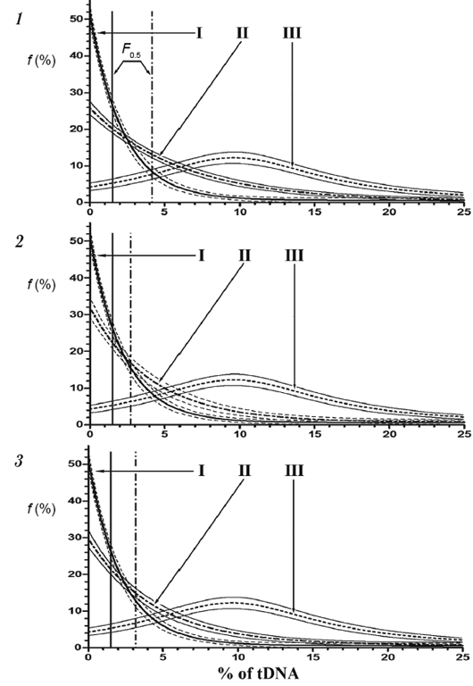 Кроме того, интерес представляет параметр half-life, обозначенный здесь как F0,5 (падение частоты встречаемости вдвое), который указывает степень поврежденности ДНК клеток при падении их частоты встречаемости в 2 раза. Этот параметр можно интерпретировать как медиану, делящую выборку на две равные части: менее и более поврежденных клеток (с содержанием ДНК соответственно в интервале от 0 до Ме и от Ме до 100 %).
