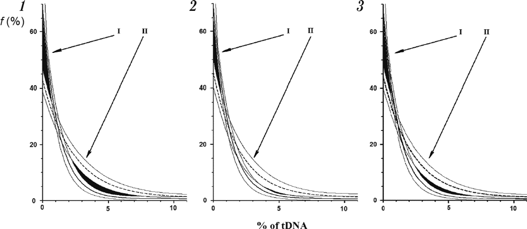 Внутригрупповых различий выявлено не было, что позволило охарактеризовать каждую группу единым уравнением: Y = (Y0 – Plateau) ∙ exp(–K ∙ X) + Plateau (табл. 1). Биологический смысл основных параметров этого распределения легко интерпретировать: Y0 (пересечение кривой с осью Y) — частота встречаемости в анализируемой выборке неповрежденных клеток; К (крутизна склона кривой) отображает скорость исчезновения клеток по мере возрастания степени поврежденности их ДНК в анализируемой выборке. Показатель «плато» (Plateau) можно рассматривать как некую константную для каждого варианта воздействия частоту встречаемости клеток с любой степенью поврежденности ДНК.