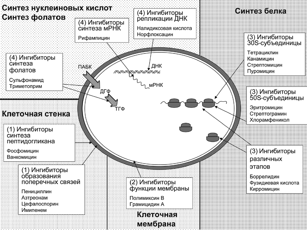 Рис. 1. Примеры мишеней действия некоторых антибиотиков. Антибиотики сгруппированы по принципу действия; цифрами обозначены группы механизмов действия антибиотиков; стрелки указывают мишени действия антибиотиков. ПАБК — парааминобензойная кислота; ДГФ — дигидрофолат; ТГФ — тетрагидрофолат