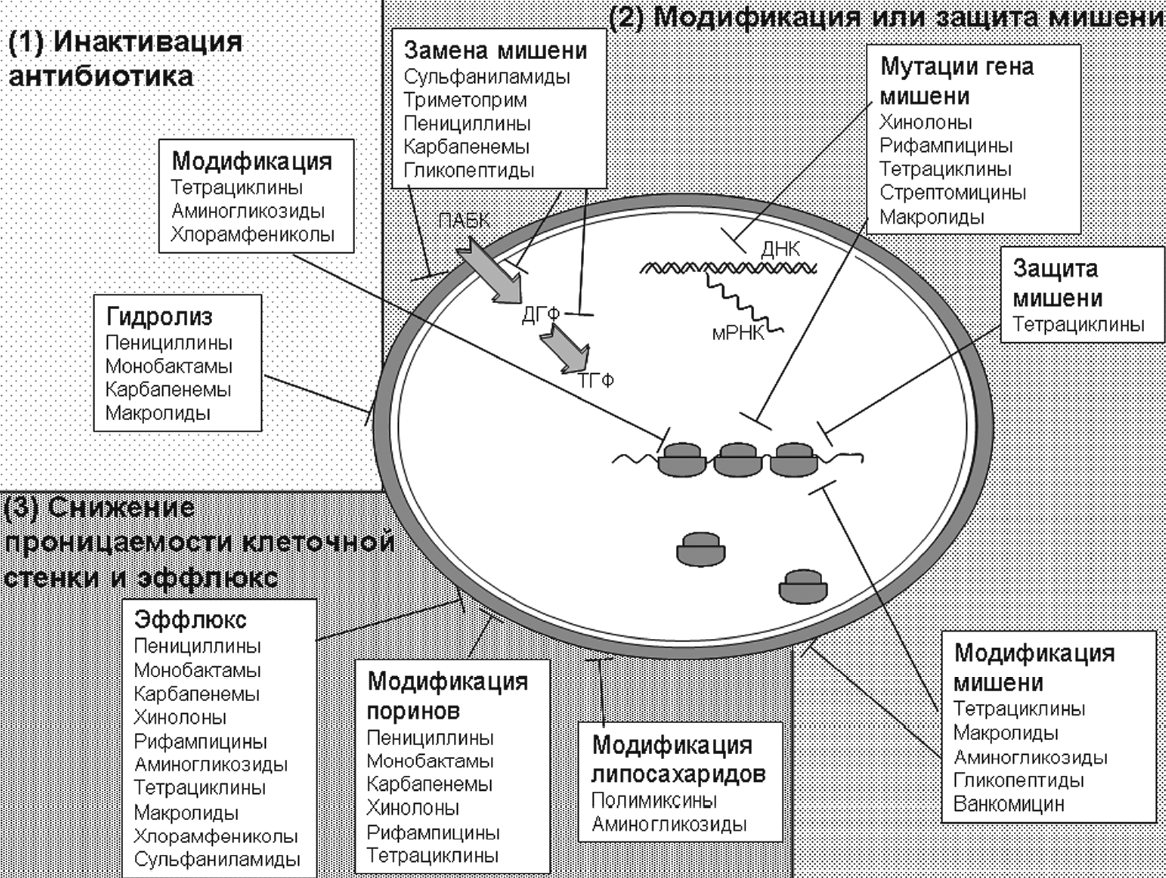 Рис. 2. Примеры бактериальной устойчивости к действию антибиотиков. Антибиотики сгруппированы по принципу бактериального ответа; цифрами обозначены группы механизмов устойчивости; линии обозначают инактивацию действия антибиотиков. ПАБК — параминобензойная кислота; ДГФ — дигидрофолат; ТГФ — тетрагидрофолат