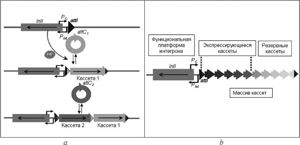 Рис. 3. Организация интегрона: а — инсерция и вырезание кассет: функциональная платформа содержит ген интегразы intI, промотор интегразы — Pint, промотор кассет — Pc и attI — рекомбинационный сайт в функциональной платформе интегрона; attC — рекомбинационный сайт в кассете. Инсерция и вырезание кассеты катализируются интегразой IntI с образованием гибридного сайта. Стрелки внутри кассет указывают направление открытых рамок считывания; b — экс прессия кассет. Кассеты обозначены короткими стрелками, уровень экспрессии обозначен интенсивностью цвета стрелок (модифицировано из [66])