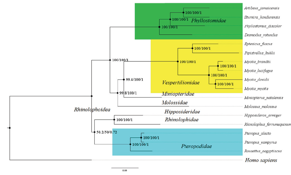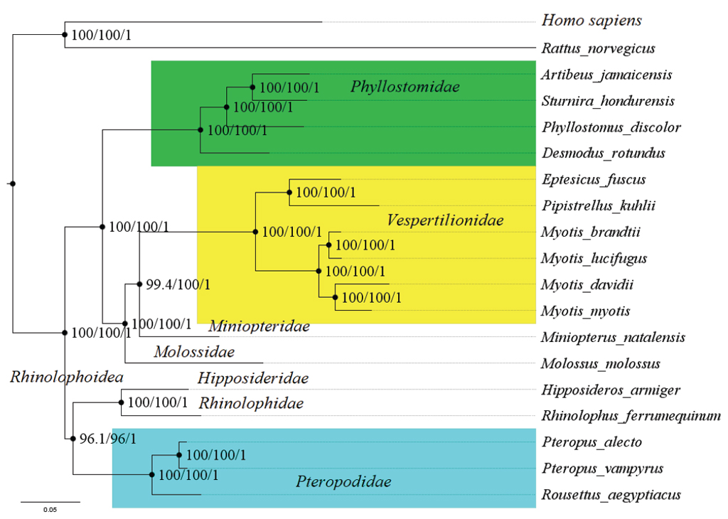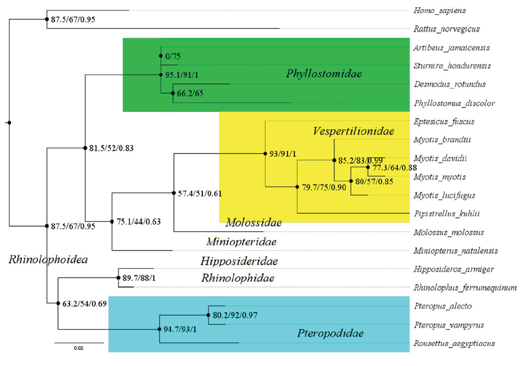 Топология, построенная на основе варианта последовательности гена, исключающей интроны, в целом, соответствует варианту, полученному на основе полной последовательности гена, за исключением резкого падения коэффициента поддержки в узле Vespertilionidae/Miniopteridae — SH-Like aLTR/Bootstrap = 59,5/54 по сравнению с SH-Like aLTR/Bootstrap = 99,4/100 в случае топологии, построенной на основе последовательности полного гена (рис. 3). Это позволяет относить этот узел к неразрешенным. Отмечается также небольшое снижение точности в других узлах, но значения коэффициентов поддержки и апостериорной вероятности все еще стабильно остаются достаточно высокими и не опускаются ниже 80 % в случае методов максимального правдоподобия и 0,95 для значения апостериорной вероятности, так что эти изменения можно считать несущественными.