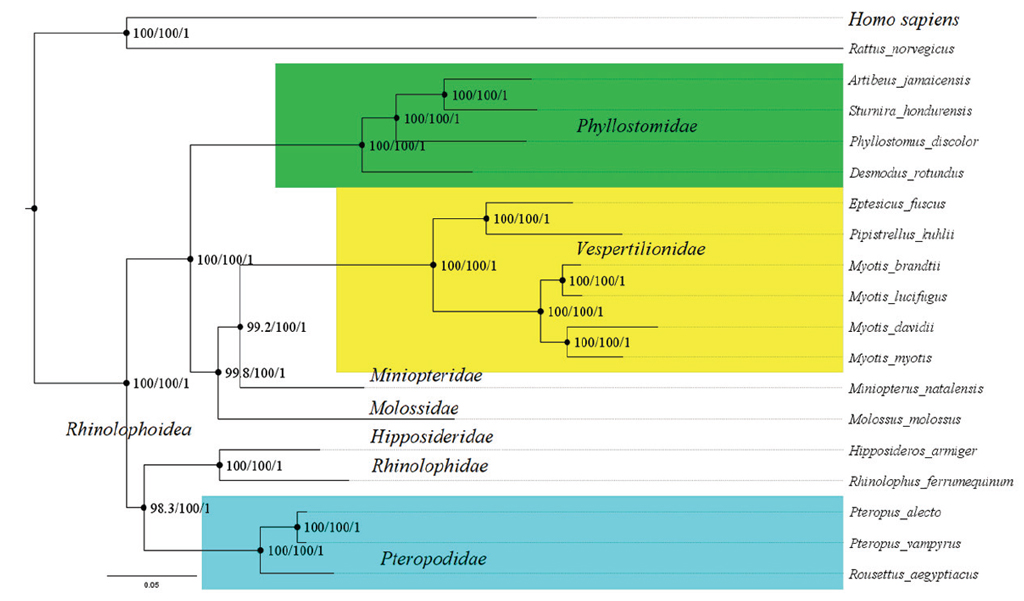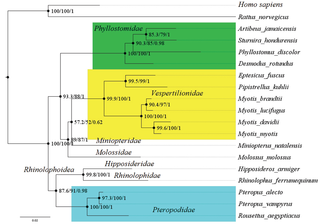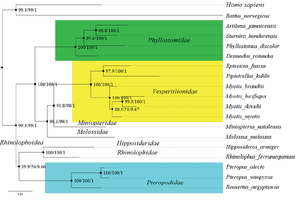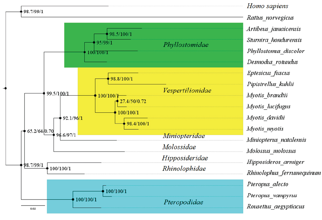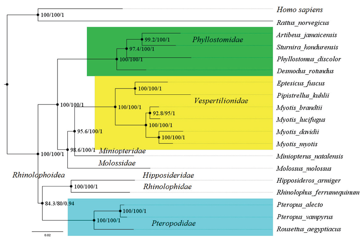 Все филогенетические деревья, полученные на основе полной последовательности гена Nxf1, имеют высокий уровень поддержки топологии, максимально возможный или близкий к нему. Общий характер ветвления, подробно описанный на примере последовательности полного гена, остается неизменным в большинстве случаев. Полученная схема поддерживает разделение на клады Yinpterochiroptera и Yangochiroptera (рис. 2) [43, 44]. Yinpterochiroptera подразделяется на две ветви, первая — представлена семейством Phyllostomidae (Artibeus jamaicensis, Desmodus rotundus, Phyllostomus discolor, Sturnira hondurensis), а вторая — образована тремя монофилитическими семействами (Vespertilionidae, Miniopteridae, Molossidae), при этом Molossidae занимает базальное, по отношению к Vespertilionidae и Miniopteridae, положение, что согласуется с данными литературы [45, 46]. Стоит отметить, что на настоящий момент нет единого мнения, какая из этих групп должна занимать базальное положение, например, в более поздней работе [47] было высказано предположение, что ранее всех обособилась группа Miniopteridae, однако сами авторы подчеркивают, что в виду особенностей дизайна эксперимента полученная схема дает лишь приблизительную оценку филогенетических отношений внутри отряда. Семейства Miniopteridae и Molossidae представлены каждое одним видом (Miniopterus natalensis и Molossus molossus соответственно), в то время как Vespertilionidae — шестью (Myotis brandtii, Myotis davidii, Myotis lucifugus, Myotis myotis, Pipistrellus kuhlii, Eptesicus kuhli). В пределах семейства также наблюдается разделение на три рода (Myotis, Eptesocus и Pipistrellus). Хотя в нашем исследовании набор представителей семейства Vespertilionidae ограничен и представлены не все рода, наблюдается сходство с результатами филогенетического анализа данного семейства, проведенного на большей выборке видов при использовании митохондриальной ДНК [48]. Результаты этого анализа подтверждают монофилию Vespertilioninae. По нашим данным, группа Yinpterochiroptera, в свою очередь, делится на две клады. Клада Rhinolophoidea представлена двумя видами, относящимися к двум разным семействам (Rhinolophidae, Rhinolophus ferrumequinum и Hipposideridae, Hipposideros armiger), и Pteropodoidae, представленная тремя видами (Pteropus alecto, Pteropus vampyrus и Rousettus aegyptiacus), относящимися к одному семейству Pteropodidae.