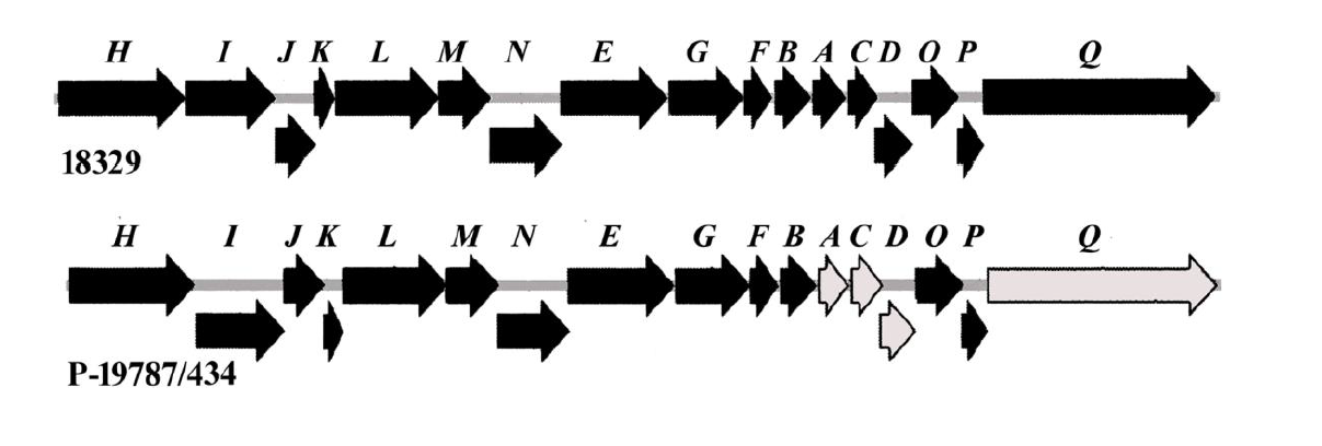 Рис. 2. Сравнение msh-кластеров двух штаммов V. cholerae. Гены, идентичные либо близкие прототипным, обозначены черным цветом, существенно отличные — серым