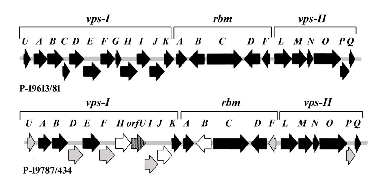 Рис. 3. Сравнение кластеров vps-I – rbm – vps-II двух штаммов V. cholerae. Гены, идентичные либо близкие прототипным, обозначены черным цветом, существенно отличные — серым, усеченные — белым, новый ген заштрихован