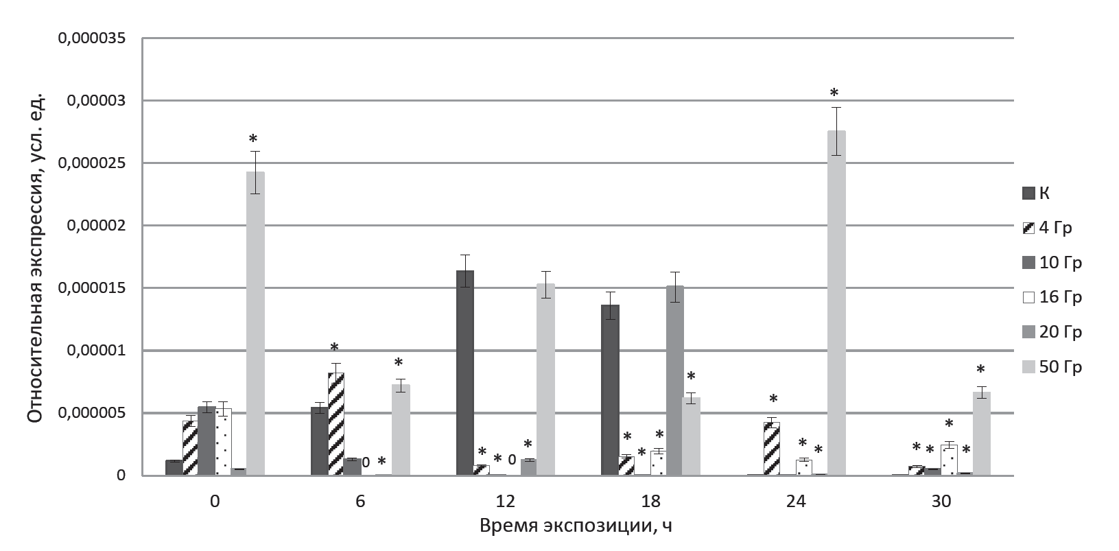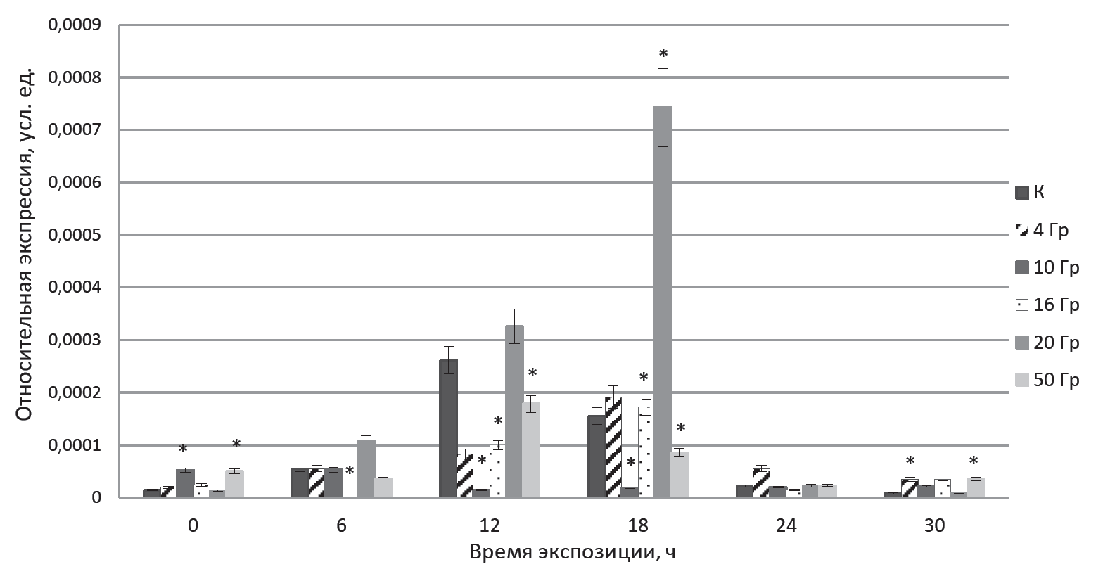 Рис. 2. Транскрипционная активность гена HvABA8’OH-1, кодирующего фермент катаболизма АБК, в зародышах в зависимости от дозы облучения семян и времени экспозиции в рулонах с дистиллированной водой. * различия статистически значимы по сравнению с контрольными значениями, p < 0,05, U-тест Манна – Уитни