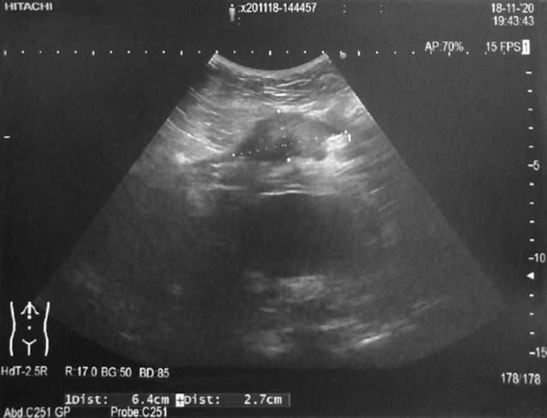 Fig. 2. Ultrasound examination of the soft tissues of the anterior abdominal wall in postoperative scar endometriosis