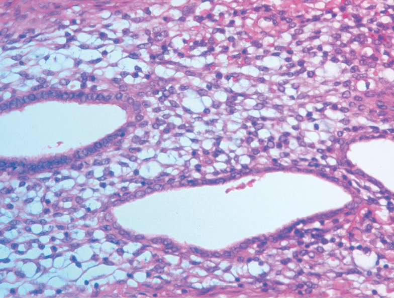 Рис. 5. Выраженная децидуальная трансформация цитогенной стромы очага эндометриоза. Окраска гематоксилином и эозином, увеличение ×200