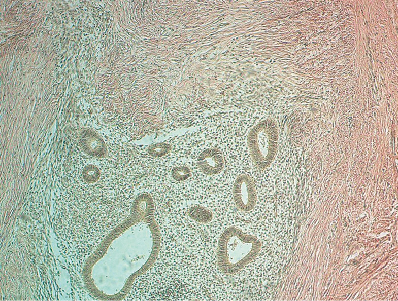 Fig. 4. The focus of the postoperative scar endometriosis. Hematoxylin-eosin stain, zoom ×100