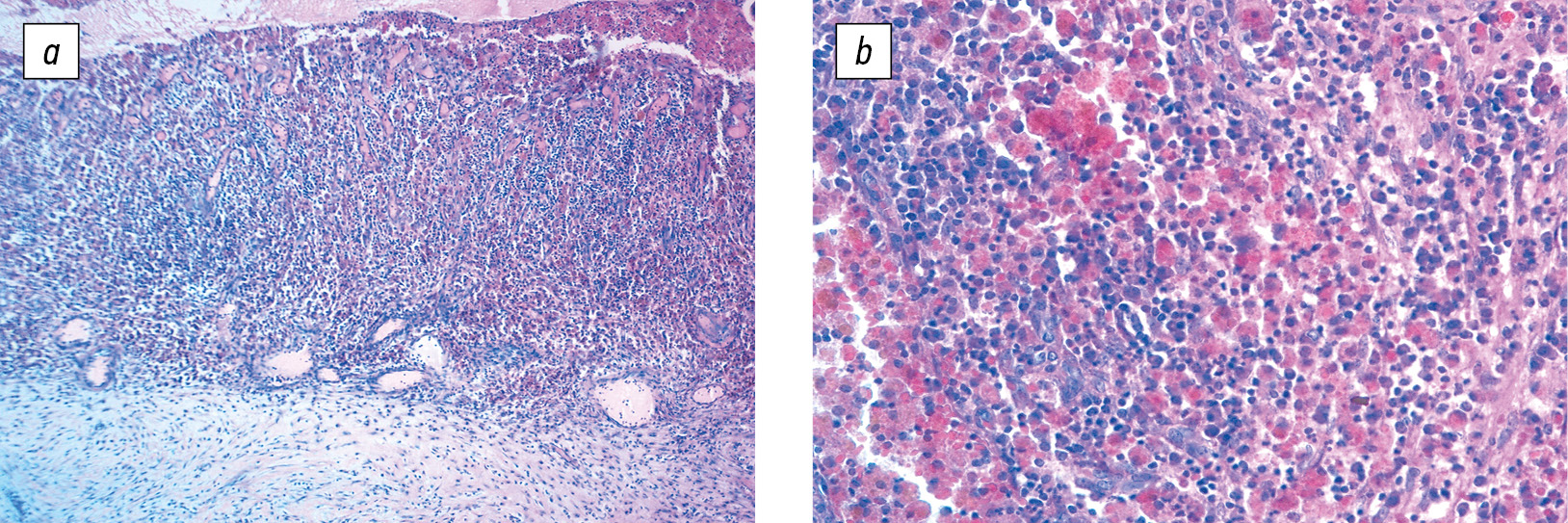Рис. 1. Гистологическое исследование операционного материала пациенток: а — лимфо-макрофагальная инфильтрация капсулы и цитогенной стромы эндометриоидной кисты, окраска гематоксилином и эозином, увеличение ×100; б — лимфо-макрофагальная инфильтрация в фокусах отложения гемосидерина, окраска гематоксилином и эозином, увеличение ×200 / Fig. 1. Histological examination of the surgical material of patients: a, сapsule lympho-macrophage infiltration and endometrioid cyst cytogenic stroma. Hematoxylin-eosin stain, zoom ×100; b, lympho-macrophage infiltration in the foci of hemosiderin deposition. Hematoxylin-eosin stain, zoom ×200
