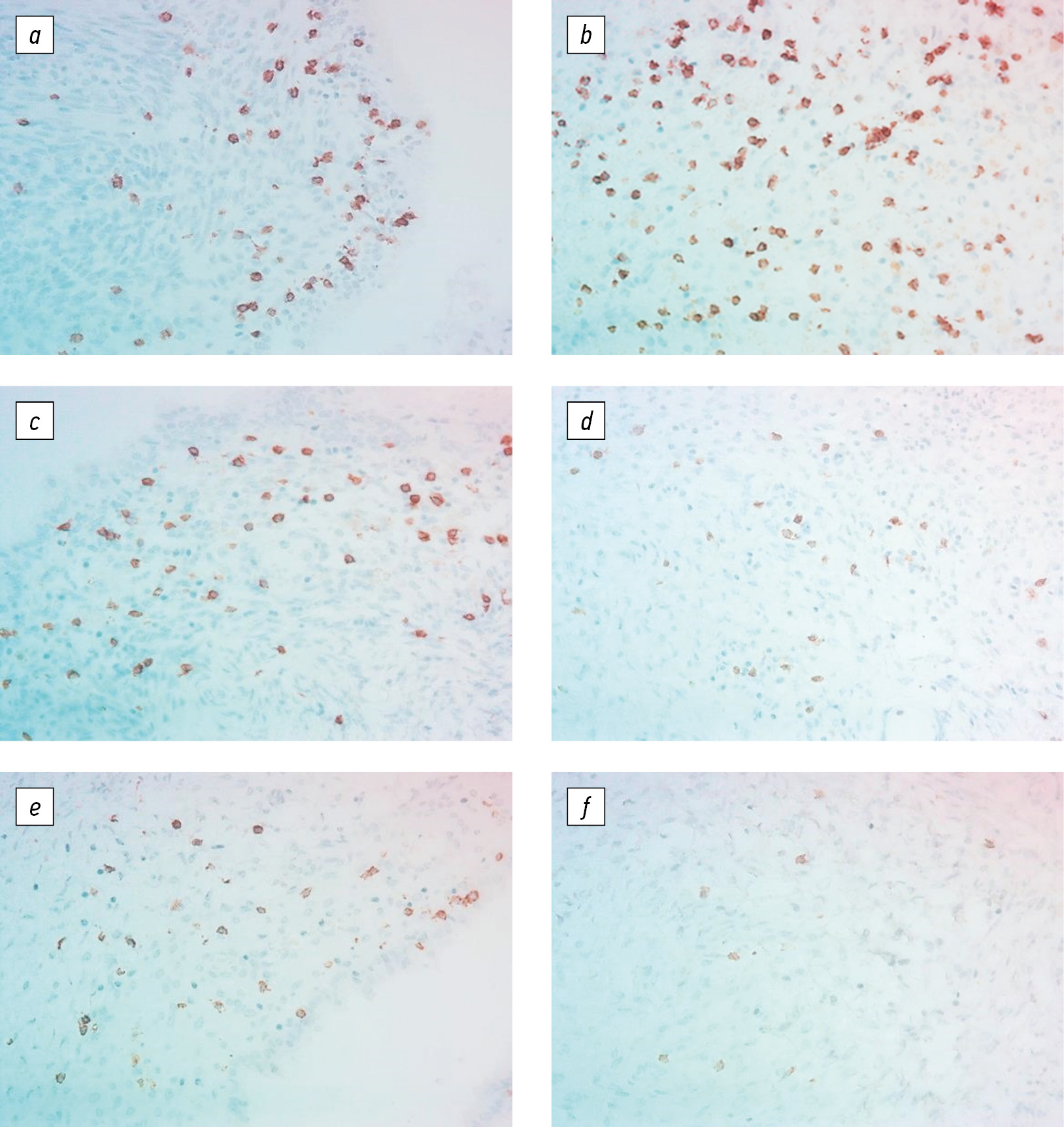 Рис. 2. Экспрессия Т-киллеров (CD8) при эндометриозе яичников: a — цитогенная строма, рецидив, первая операция; b — капсула кисты, рецидив, первая операция; c — цитогенная строма, рецидив, вторая операция; d — капсула кисты, рецидив, вторая операция; e — цитогенная строма, без рецидива; f — капсула кисты, без рецидива. Иммуногистохимическое исследование, увеличение ×100 / Fig. 2. T killers expression (CD8+) in ovarian endometriosis: a, cytogenic stroma, relapse, the first operation; b, cyst capsule, relapse, the first operation; c, cytogenic stroma, relapse, the second operation; d, cyst capsule, relapse, the second operation; e, cytogenic stroma, without relapse; f, cyst capsule, without relapse. Immunohistochemical examination, zoom ×100