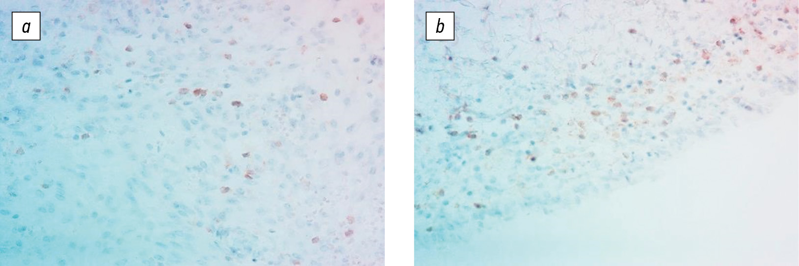 Рис. 3. Экспрессия Т-хелперов (CD4) у пациенток с рецидивирующем течением эндометриоза яичников: а — в капсуле эндометриоидной кисты; б — в цитогенной строме. Иммуногистохимическое исследование, увеличение ×100 / Fig. 3. T helpers expression (CD4) in recurrent ovarian endometriosis: a, cyst capsule; b, cytogenic stroma. Immunohistochemical examination, zoom ×100