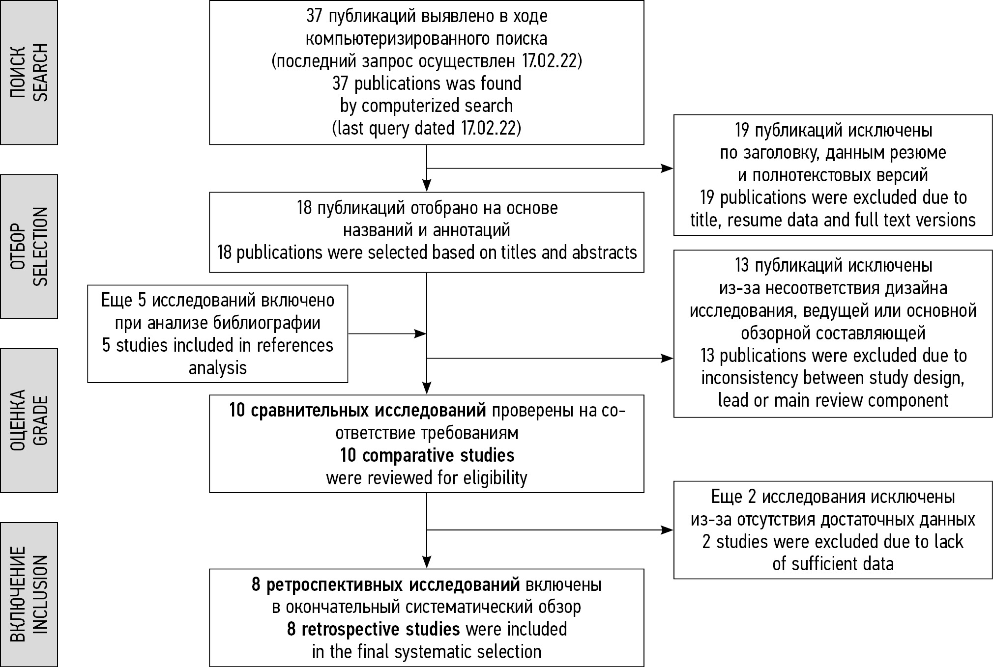 Работа проведена в соответствии с принципами «Предпочтительных элементов отчетности для систематических обзоров и метаанализов» (PRISMA). Поиск литературы осуществлен в библиографических базах Medline, ClinicalKey, Google Scholar, Embase, The Cochrane Library, eLIBRARY. Оцениваемый период публикаций охватил 24 года (1999–2022 гг.). Ключевые слова для поиска были определены по принципу PICO (P — популяция или пациенты, I — вмешательство, C — сравнение и O — исходы) и включили: «female», «women», «infertility», «infertility treatment», «in vitro fertilization», «IVF», «assisted reproductive technologies», «ART», «ovarian stimulation», «ovarian hyperstimulation», «clomiphene citrate», «hCG», «hMG», «tamoxifen», «uterine», «endometrial», «cancer», «carcinoma neoplasm», «uterine neoplasm». В ходе поиска использованы операторы SQL — AND и OR. Поиск проходил по заголовкам и текстам работ. К найденным работам применен инструмент «Связанные статьи», а также проанализированы библиографические ссылки связанных работ. Согласно алгоритму поиска в отчетный период найдено 37 репрезентативных публикаций, далее выбрано 8 исследований для метаанализа (рис. 1).
