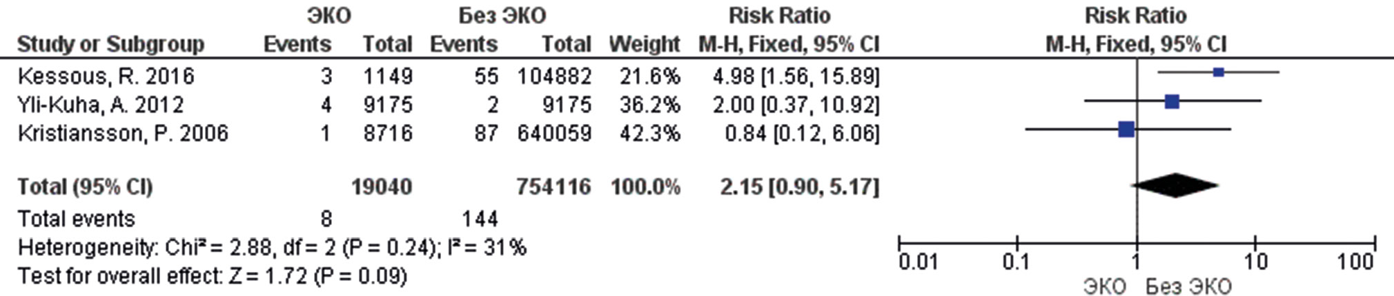 По объединенным данным трех исследований (рис. 2), частота выявления рака тела матки составила 0,04 % (рак обнаружен у 8 из 19 040 женщин) в группе ЭКО и 0,19 % (рак обнаружен у 144 из 754 116 женщин) в группе без ЭКО. В соответствии со значением Q-критерия Кохрена данные гомогенны (p > 1), показатель I2 демонстрирует умеренную степень гетерогенности. На основе результатов составлена модель с фиксированным эффектом и не получено статистически значимых различий в показателях частоты обнаружения рака тела матки в обеих группах (ОР 2,15 [0, 90; 5, 17]).