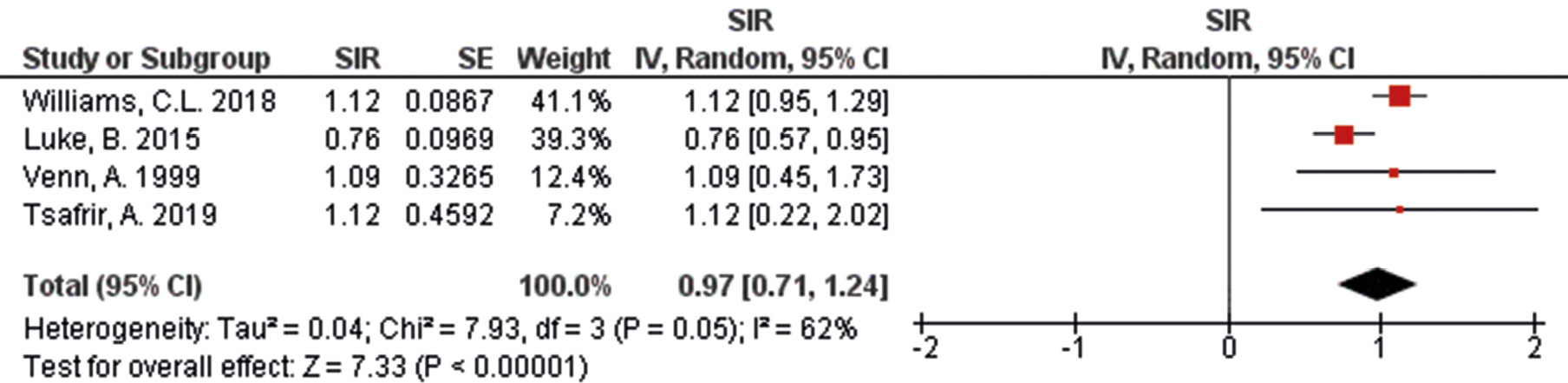 Следующий анализ объединил результаты четырех исследований (рис. 3), в качестве оцениваемого показателя выступил стандартизированный показатель (SIR) обнаружения злокачественных новообразований тела матки после процедуры ЭКО. В целом, показатели различных отдельных исследований были близки к сопоставимости по общему риску появления злокачественных новообразований тела матки. В соответствии с данными Q-критерия Кохрена данные гетерогенны (p < 1), тогда как показатель I2 демонстрирует значительную степень гетерогенности (I2 = 62 %). На основе результатов составлена модель случайных эффектов. Суммарный анализ не продемонстрировал статистически значимых различий (SIR 0,97 [0, 71; 1, 24]).