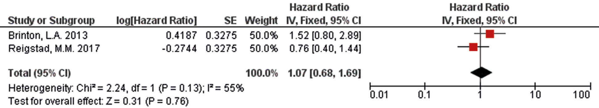 По объединенным данным двух исследований (рис. 4), в соответствии со значением Q-критерия Кохрена данные гетерогенны (p > 1), показатель I2 демонстрирует значительную степень гетерогенности (I2 = 55 %). В этом случае, согласно принятой методике, необходимо учитывать в первую очередь данные теста χ2, поэтому выбрана модель с фиксированным эффектом. Не получено статистически значимых различий в показателях HR развития рака эндометрия в случае применения ЭКО (HR 2,15 [0, 90; 5, 17]).