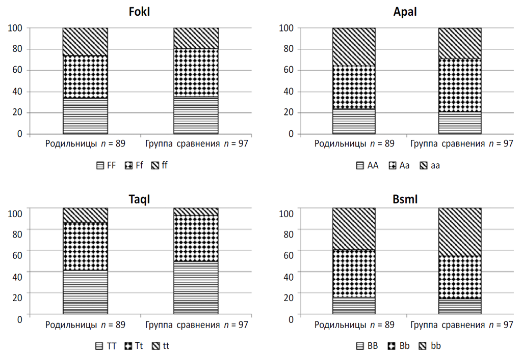Методом ПЦР-ПДРФ произведено определение генотипов аллельных вариантов FokI, ApaI, BsmI, TaqI гена VDR всем пациенткам. На рис. 1 приведены данные частоты встречаемости разных аллелей FokI, ApaI, BsmI, TaqI у родильниц и пациенток группы сравнения. Из рисунка видно, что распределение генотипов аллельных вариантов в обеих группах было равноценным, что означает, что исследованные группы были сравнимы.