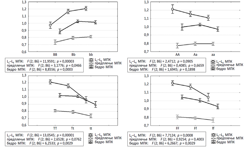 В дальнейшем, с учетом полученных данных, была проанализирована взаимосвязь аллельных вариантов FokI, ApaI, BsmI, TaqI и уровня МПК в разных отделах скелета у родильниц. Анализ продемонстрировал достоверные различия МПК во всех исследованных отделах скелета в зависимости от генотипа (рис. 2).