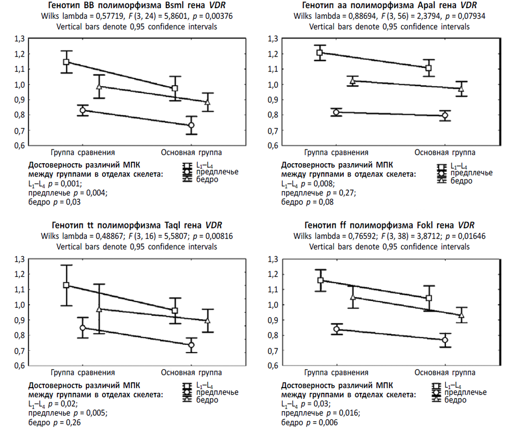 Во всех четырех исследованных случаях была видна характерная особенность: в группе родильниц МПК во всех обследованных участках скелета была ниже, чем у пациенток группы сравнения. При этом при наличии генотипа ВВ полиморфизма BsmI гена VDR были выявлены статистически значимые различия МПК между группами во всех трех обследованных отделах скелета. Анализ показал, что при наличии генотипа аа полиморфизма ApaI гена VDR достоверные отличия МПК родильниц и пациенток группы сравнения имеются только в поясничном отделе позвоночника. Генотип tt полиморфизма TaqI гена VDR был связан с достоверно более низкими значениями МПК в поясничном отделе позвоночника и дистальном отделе предплечья в группе родильниц по сравнению с группой сравнения. Достоверные различия МПК были обнаружены в поясничном отделе позвоночника у пациенток обследованных групп при наличии у них генотипа ff полиморфизма FokI гена VDR.