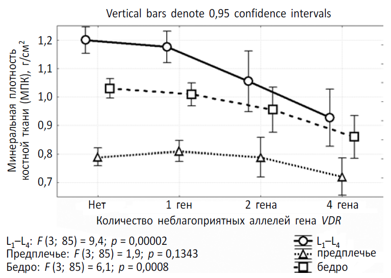Таким образом, результаты проведенного исследования показали взаимосвязь между определенными аллелями VDR и МПК у родильниц. Высокая предрасположенность к развитию остеопении при беременности отмечается у пациенток с вариантом ff аллеля FokI, аа аллеля ApaI, ВВ аллеля BsmI и tt аллеля TaqI. Следует отметить, что носительство нескольких неблагоприятных аллелей у беременной связано с еще более значительным уменьшением МПК во всех трех исследованных участках скелета, при этом наиболее уязвимой локализацией является поясничный отдел позвоночника, где потеря МПК была выражена в большей степени.