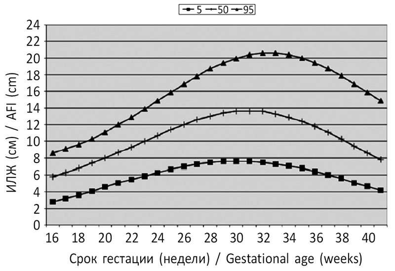 При этом данные E.F. Magann et al. значимо (минимум на 2 см) отличаются от результатов J.R. Phelan и T.R. Moore: 5-й процентиль — 5 против 7 см, 50-й процентиль — 9,5 против 12 см соответственно [11, 23, 25, 26]. Данные N.D. Hinh и J.L. Ladinsky отличаются от результатов T.R. Moore не менее значимо [27]. Учитывая большую вариабельность диапазона нормативного значения ИАЖ, заслуживает внимание исследование H. Lei и S.W. Wen, проведенное на популяции Китая [28].