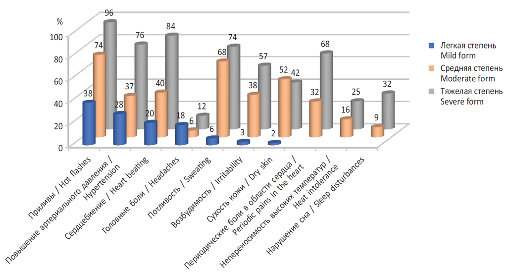Нейровегетативный синдром был выражен у всех женщин вне зависимости от длительности эстрогендефицитного состояния и степени тяжести климактерического синдрома. При легкой степени тяжести климактерического синдрома наиболее часто встречающимися жалобами являлись приливы (38 %), повышение АД (28 %), сердцебиение (20 %), головные боли (18,0 %), потливость (6 %), возбудимость (3 %), сухость кожи (2 %). При средней степени тяжести климактерического синдрома пациентки предъявляли жалобы преимущественно на приливы (74 %), потливость (68 %), сухость кожных покровов и слизистых оболочек (52 %), сердцебиение (40 %), возбудимость (38 %), периодические боли в области сердца (32 %), непереносимость высоких температур (16 %), нарушения сна (9 %). При тяжелой степени тяжести превалировали такие жалобы, как приливы (96 %), сердцебиение (84 %), повышение АД (76 %), периодические боли в области сердца (68 %), возбудимость (57 %), потливость (74 %), сухость кожных покровов и слизистых оболочек (42 %), нарушения сна (32 %), непереносимость высоких температур (25 %), головные боли (12 %) (рис. 1).