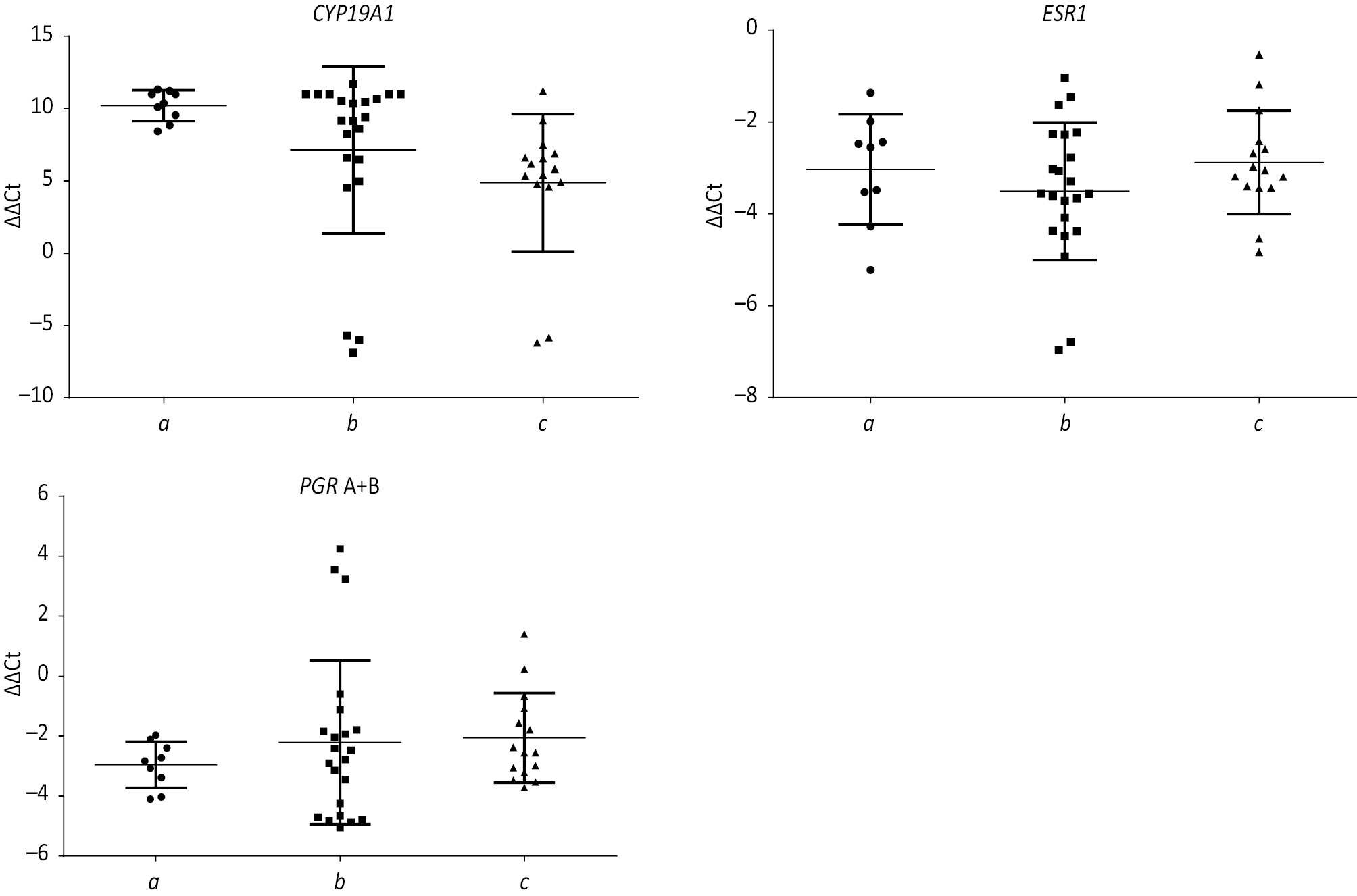 Fig. 1. CYP19A1, ESR1 and PGR gene expression in the eutopic endometrium of patients without (a) and with endometriosis (b) and in endometrioid lesions (c)