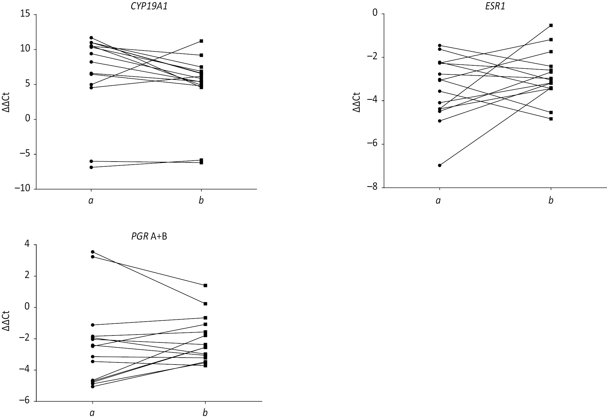 Fig. 2. Differential CYP19A1, ESR1 and PGR gene expression analysis for paired samples of the eutopic endometrium from patients with endometriosis (a) and of endometrioid lesions (b)