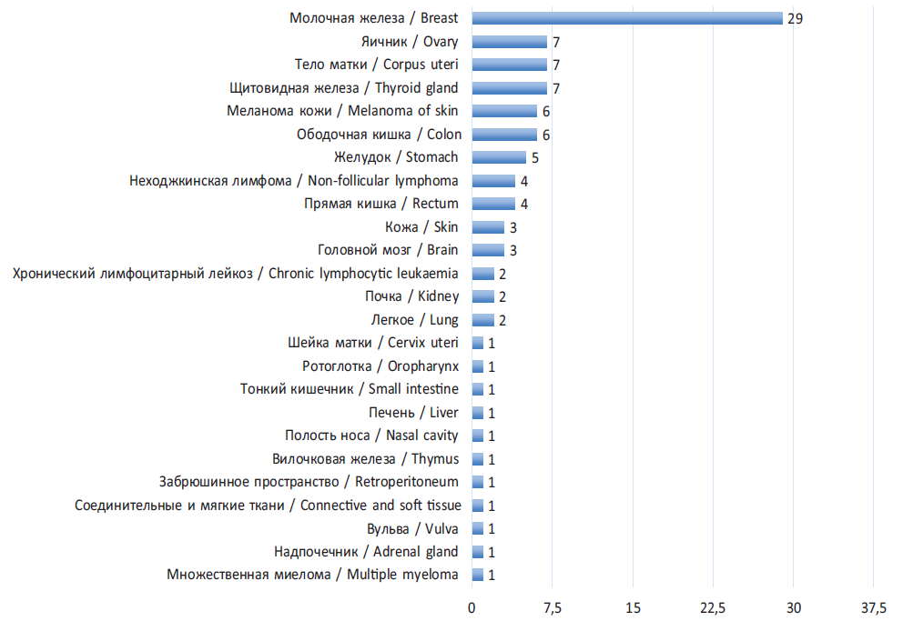 В структуре выявленных ЗНО (рис. 1) преобладали рак молочной железы (n = 29), РЯ (n = 7), рак тела матки (n = 7), рак щитовидной железы (n = 7), колоректальный рак (n = 6), а также кожная меланома (n = 6), неходжкинская лимфома (n = 4) и глиобластома (n = 3).