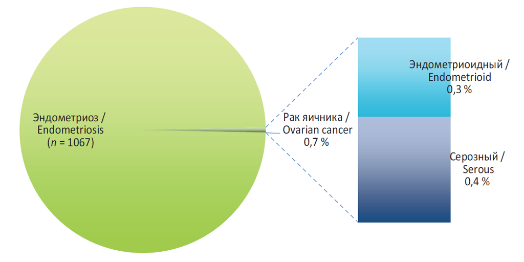 Согласно данным литературы карциномы яичника развиваются у 0,3–1,6 % женщин с эндометриозом [8, 9], а до 30,0 % пациенток с РЯ имеют в анамнезе эндометриоз [6].
