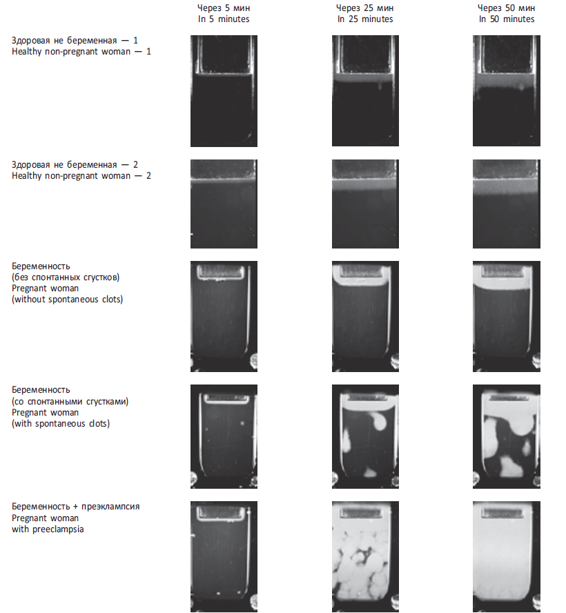 Следует обратить внимание на то, что у здоровых небеременных спонтанный рост сгустка наблюдался только в двух случаях из 35 (5,7 %), у беременных — в 20 из 22 (91 %) и беременных с преэклампсией — в 16 из 18 (88,9 %). У одной беременной с преэклампсией спонтанные сгустки были зафиксированы уже на 5-й минуте.