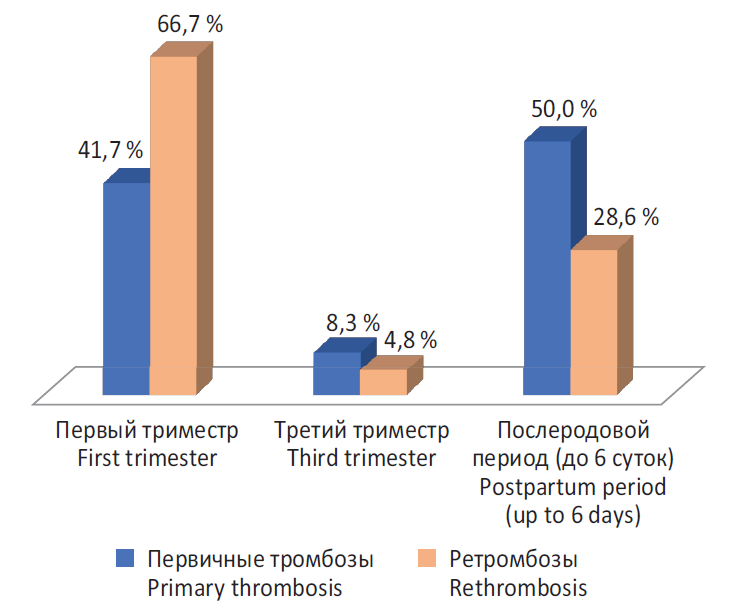 Как видно из рисунка, основное число тромбозов в настоящем исследовании приходилось на первый триместр и послеродовой период. Во втором триместре тромботических событий зарегистрировано не было. Полученные результаты свидетельствуют в пользу того, что ретромбозы возникают преимущественно в первом триместре (66,7 %). Вероятно, данный факт объясняется избирательным назначением ранней антенатальной гепаринопрофилактики пациенткам с однократным эпизодом ВТЭО в анамнезе. На основании полученных результатов было рассчитано, что назначение ранней антенатальной гепаринопрофилактики пациенткам с однократным эпизодом тромбоза в анамнезе снижает риск ретромбоза в 2 раза (ОШ 0,45; 95 % ДИ 0,02–0,828; р = 0,0369).