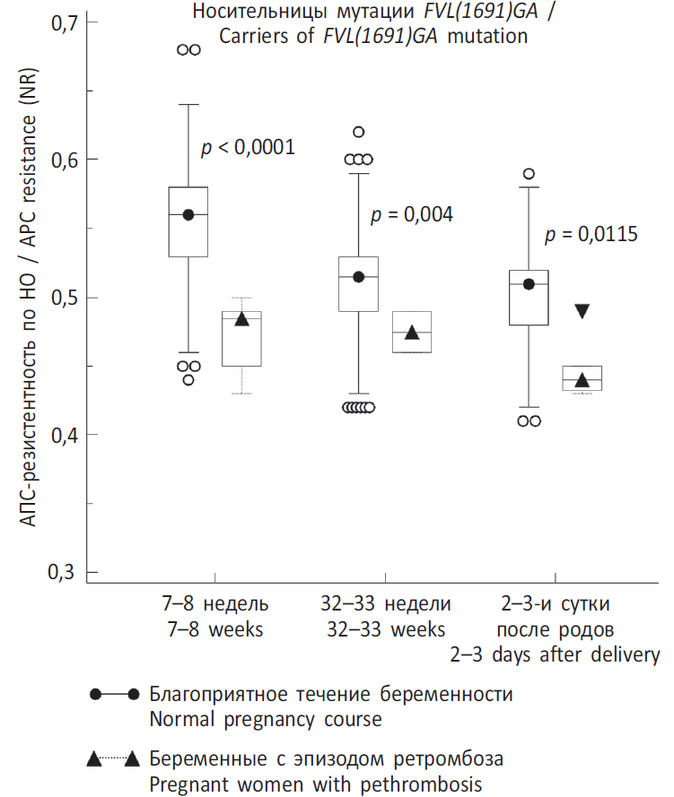 Во время беременности медиана (предшествующая эпизоду ретромбоза) показателя НО, отражающего степень АПС-резистентности, в первом триместре (7–8 недель) составила 0,49 (95 % ДИ 0,43–0,49); в третьем триместре (32 недели) — 0,48 (95 % ДИ 0,46–0,49); на 2–3-и сутки после родов — 0,44 (95 % ДИ 0,43–0,48) и была статистически значимо ниже, чем в группе женщин с благоприятным течением беременности при генотипе FVL(1691)GA (рис. 2). В последнем случае НО составило соответственно 0,56 (95 % ДИ 0,53–0,58) в 7–8 недель; 0,51 (95 % ДИ 0,50–0,53) в 32 недели и 0,51 (95 % ДИ 0,49–0,53) на 2–3-и сутки после родов.